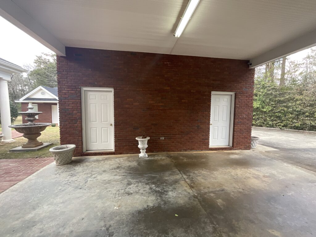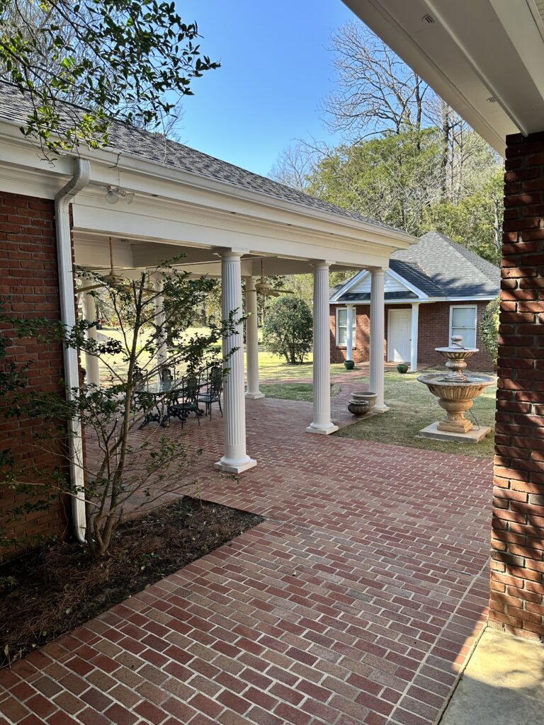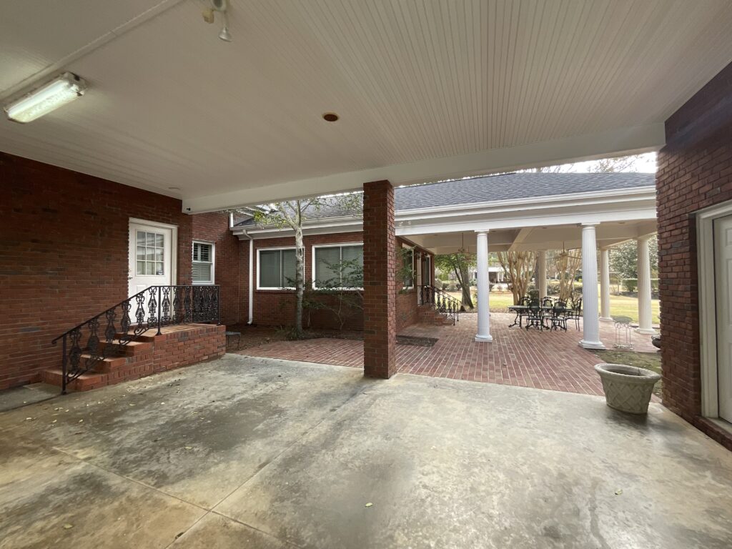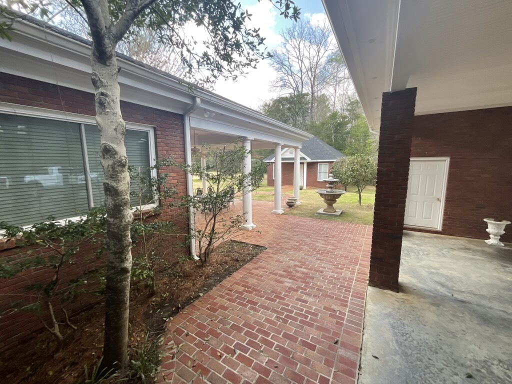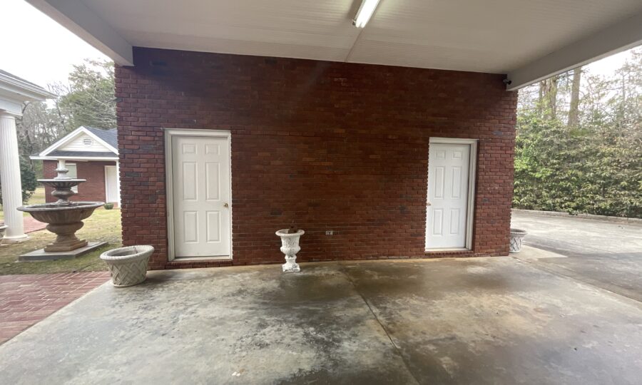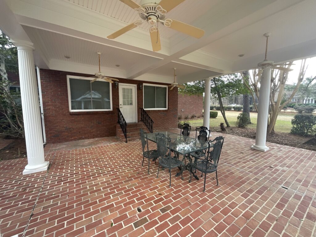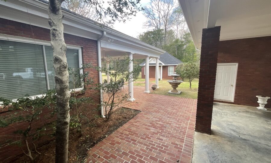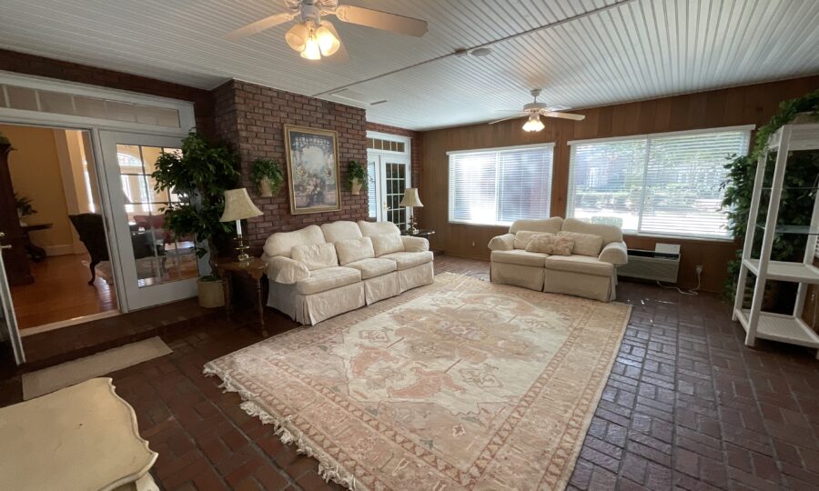 Enjoy outdoor living with a covered brick porch, charming courtyard area, and sunroom. Additional features include outside storage building and multiple interior storage rooms.